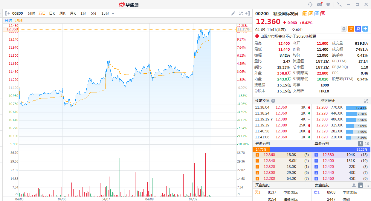 截止目前,新濠国际发展股价12.36港元,上涨8.42%。