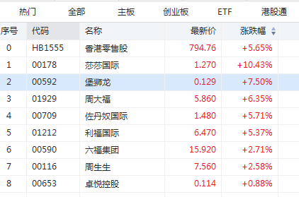 新浪港股讯 4月9日消息,香港零售股集体走高。其中,新秀丽大涨11%,莎莎国际涨9.57%,佐丹奴国际涨5.7%,周大福涨5.08%,利福国际涨5.2%,翠华控股涨12.5%。