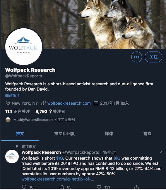 同时,该机构在推特上发布了“做空宣言”,此前做空瑞幸的浑水(Muddywaters)也在推特上表明协助了狼群对爱奇艺进行研究,并随后做空了爱奇艺股票。
