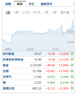 美、布两油短线跳水,美油涨幅不足2%,报25.59美元/桶,布油涨1.58%,现报33.52美元/桶。欧佩克代表称欧佩克+框架协议是减产1000万桶/日,欧佩克仍在继续研究协议,减产目标能调整。