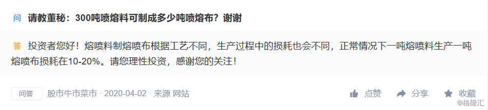 另外,公司还表示已接到海外订单,但出口占比并不大。公司官网表示,截至4月2日,海外熔喷料订单近千吨,大概为公司当前不到三日的产能。按去年年报披露数据,公司境外产品销售收入占比为6.79%。