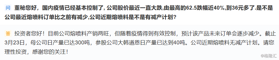 至于被问及未来全球疫情缓解之后,公司产能会否出现过剩,道恩则回应会对熔喷料产线进行产能调节及产品切换消化公司新增产能,熔喷料行业亦存在产能过剩的风险。