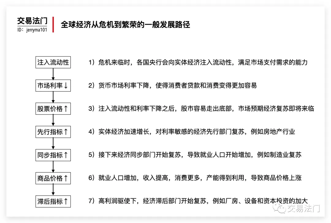 这是一个比较典型的从危机到繁荣的发展过程:最初是央行向实体经济注入流动性并降低利率,股市率先有一个良好的经济复苏预期,走出底部,接下来就是实体经济不同的部门先后开始复苏,股市根据经济复苏的情况不断上涨。