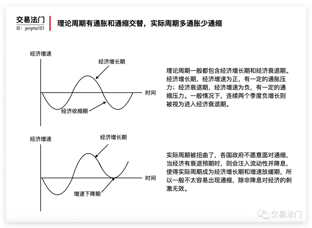 所以对于这个问题,我打算闲谈一下周期问题,包括理论周期和实际周期,理论周期是包含通胀和通缩阶段的,实际周期往往只有通胀没有通缩;然后再谈一下全球经济从危机走向繁荣的大体过程,