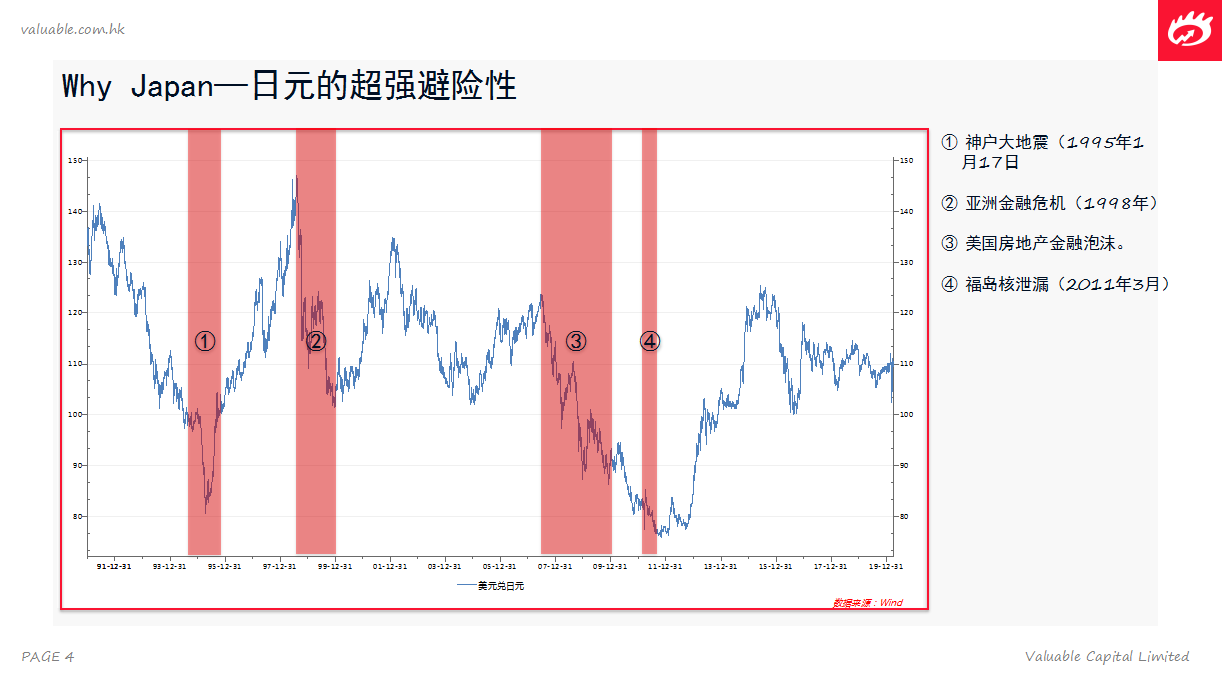 我们说日元是传统的避险资产,可以看一张美元兑日元的汇率图,三条红线对应着三次天灾或人祸,但你会发现不管和日本有管与否,危机出现后,日元都是率先升值。(往下走代表升值,向上代表贬值)这三次危机分别是1995年的神户大地站、97-08年的亚洲金融危机、2007年的美债危机和2011年的福岛核泄漏。