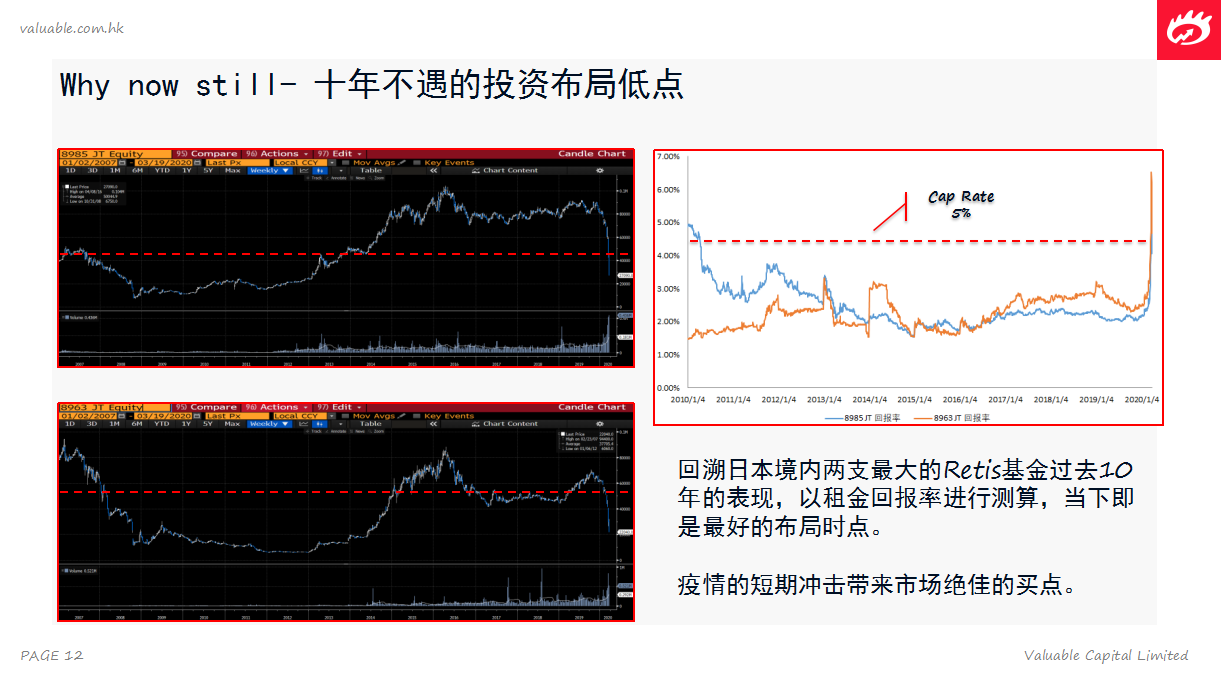 再次聚焦投资的时点问题,我们用3张图来说明,左图是2至在日本上市的retis长达10年的走势表现。不难发现近期的表现已接近历史的低位。如果将其转换为租金报酬率的波动曲线,更会发现当前投资下的隐含回报率已接近7%的历史高位。所以,请善待并拥抱每一次危机,而不是白白浪费掉。