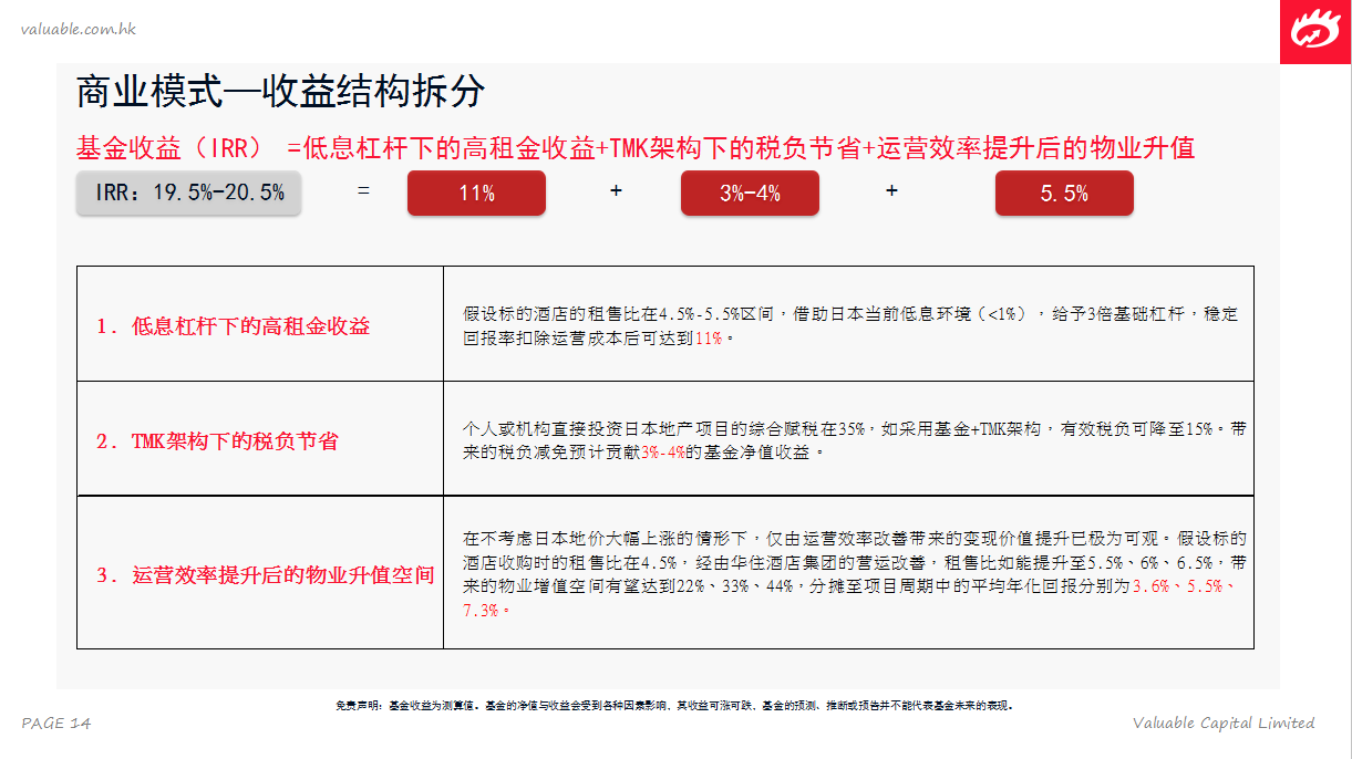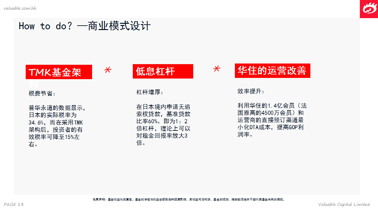 日本的酒店基金是非常专业化的运作方式,所以在设计上我们吸纳了三大特色:1. TMK的基金架构(简单理解为VIE架构),设计的目的在于合理降低税费负担。2. 本地化的低息杠杆,增厚利润回报。3. 引入华住酒店的运营管理,不仅降低获客成本,还有效改善运营效率。
