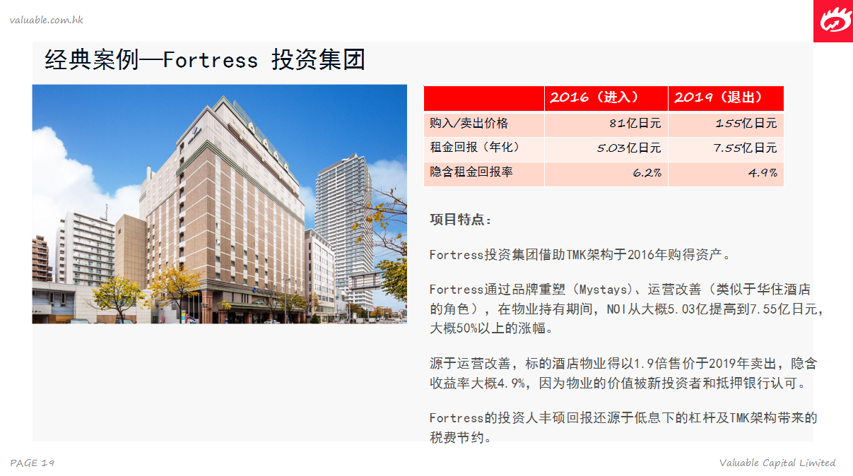 现在我们把一个美国基金(Fortress) 操作的一个案例作为一个示范,Fortress是一个美国基金,他们在日本过去10年左右已经用收购/改造和重新营运的方式做了超过100家酒店,主要的品牌就是Mystays, 然后前几年也成功的把他们的酒店资产打造成一个REITs, 在日本上市, 叫Invincible Reits。