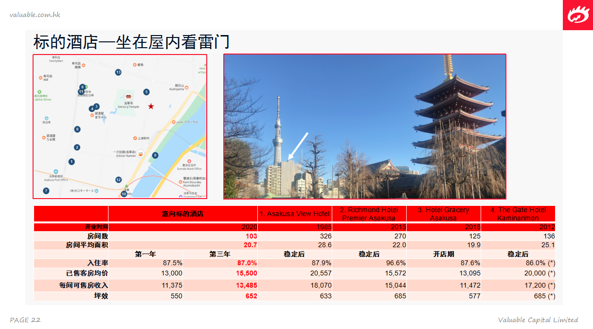 这是一个东京浅草的项目,在图的左上方标星那个位置就是它的位置,然后你看右边的照片,位置非常好,也是中国游客非常热门的居住区域, 然后附近的酒店入住率非常高, 平均也到85-93% 左右。