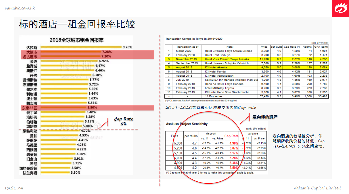 我们再看回 24页,我们之前的模型推测了我们潜在收购的酒店因为市场大幅下调,可以用53亿日元或者以下买下来,对比去年这些交易的cap rate, 这11个酒店平均的折让大概从 12-20%, 但是, 我们要强调一点,我们想收购的这个酒店位置非常优越,包括我们跟本地的银行初步的接触都证明大家对这个位置非常看好, 所以我们觉得对标的物业应该是 第3和5这两个酒店,这两个都在赤坂中心的位置,交通便利,所以我们现在买的话,我们觉得是以40%或以上 跟去年实在成交的折让买下来这个酒店。