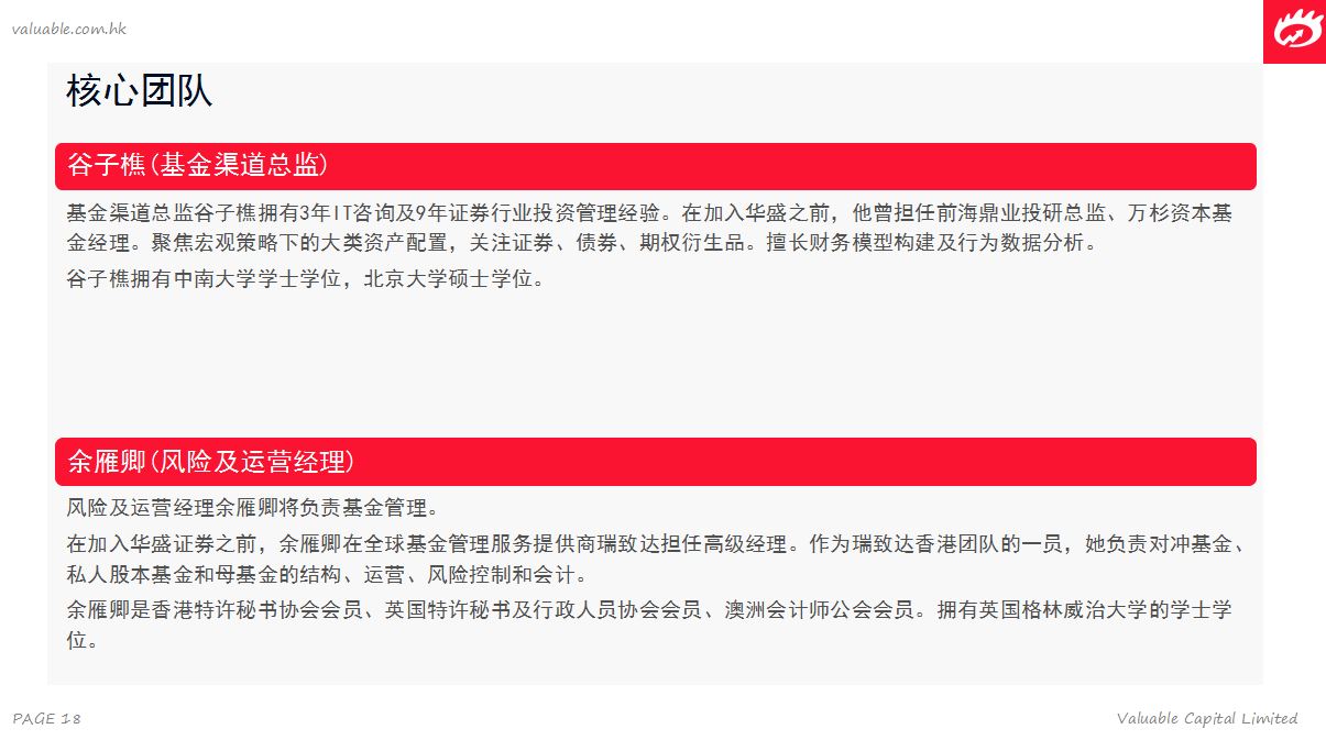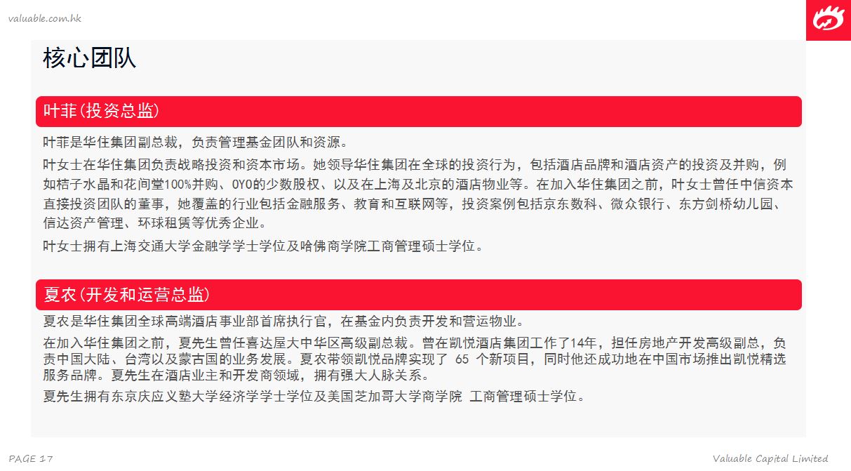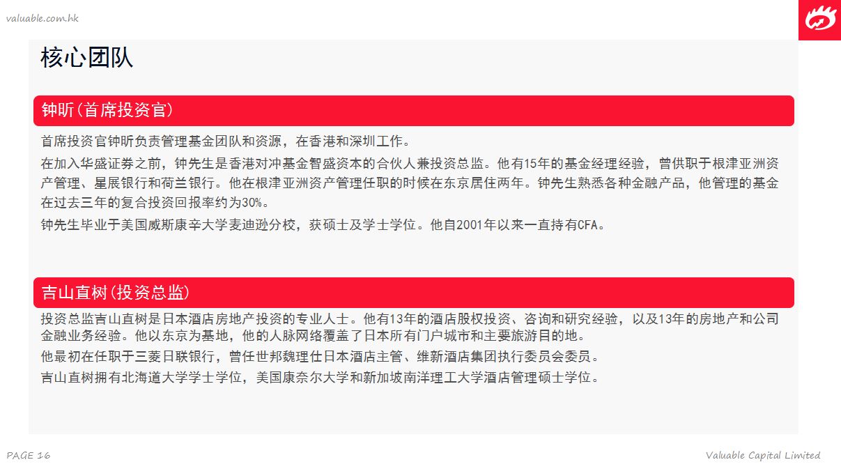 那接着我们先简单介绍一下这个基金的核心团队,因为这个基金的理念,是先找到好的物业买下来,再进行主动管理和操盘提升价值,所以我们的团队是结合了金融投资和酒店营运的一个团队。