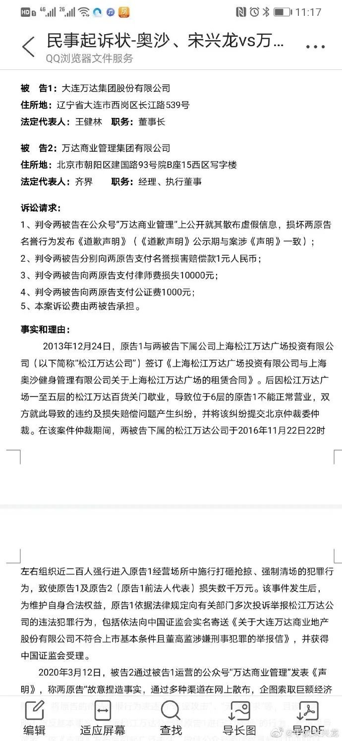 针对宋兴龙对万达集团和万达商管的起诉,记者4月10日联系了万达集团相关人士,其表示:“公司暂时没有回应。”