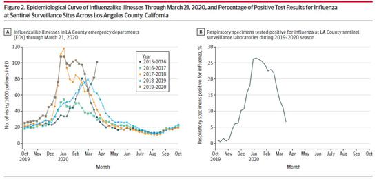 近日,美国研究者在《美国医学会杂志》(JAMA)以研究快报(Research Letter)的形式发表了一项研究,指出通过对3月中旬洛杉矶郡哨点门诊的监测研究,发现部分流感样疾病患者新冠病毒呈阳性,这意味着此前发生的“流感高峰”很不寻常,新冠病毒可能早已发生了较广泛的隐性社区传播。