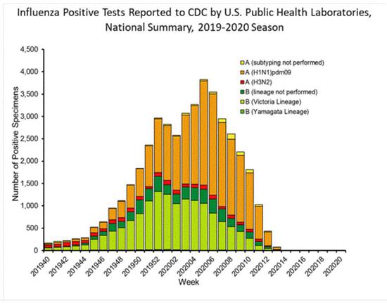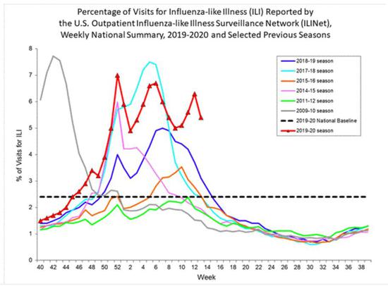 截至3月28日的2020年第13周美国流感监测周报,红色曲线代表2019-20年流感季,可以清晰看出不同于往年的第三次高峰