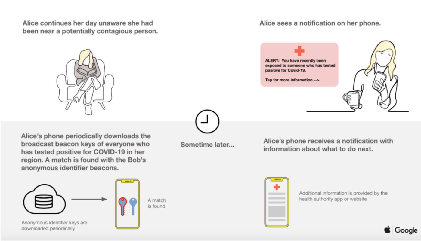爱丽丝继续她的生活,毫不知晓她接触了有可能带来传染的患者。但她的手机应用却在不时下载同一地区新冠患者的匿名身份密钥,并和她手机储存的近期接触人密钥匹配——鲍勃的匿名密钥匹配上了。