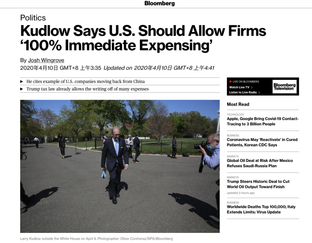 彭博社报道提到,库德洛发表这番言论的背景是,目前,美国政府正在找寻办法,以提振因新冠病毒大流行而陷入困境的经济。库德洛的提议则是针对美国如何摆脱对中国制造业依赖的这一问题提到的。他说,“我认为100%费用化将是一件非常好的事情,顺便提一下,这对美国国内的公司来说也将是一件非常不错的事。”