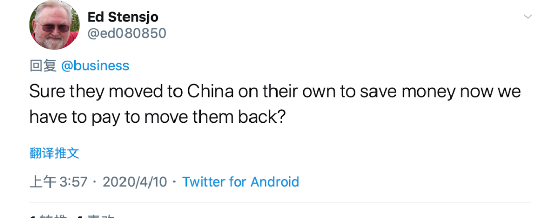 一位名叫Ed Stensjo的美国网友认为库德洛的提议是在让纳税人埋单,他反问:“当然,他们(企业)自己搬去中国就是为了节省资金,(但)现在我们必须去为他们的回流埋单?”↓