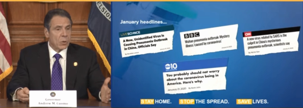 接着,科莫开始拿媒体文章举例子,“你们可以回去看看1月份各大媒体的头条新闻,你能看到种种疑问,你能看到种种警告。”这时候,科莫旁边的PPT上展示了欧美主流媒体一二月份对疫情的报道截图。
