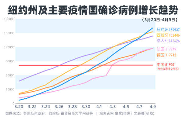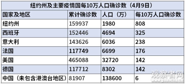 观察者网梳理发现,目前为止,纽约州累计确诊约16万新冠肺炎病例,超除美国外所有国家。每10万纽约州人中,就有超800人确诊感染新冠病毒,这一数字是疫情最严重欧洲国家西班牙和意大利的2至3倍。