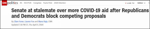 这种情况如果继续,救助金将很快见底。为此,特朗普日前要求国会迅速批准追加2500亿美元救助金,加大救助力度。但是两党在刚刚过去的4月9日辩论中,吵来吵去,无法达成一致。美国各大媒体对此聚焦,字里行间透露着“别再吵了”的焦急。