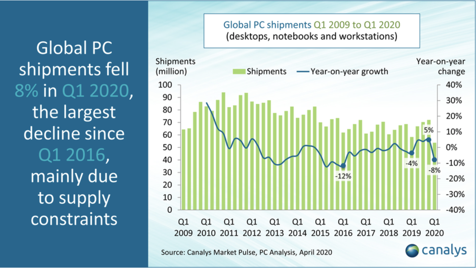 根据 Canalys 本周分享的新数据,估计苹果的 Mac 出货量在 2020 年第一季度下降了 20%以上。由于全球企业和工厂的关闭导致“生产和物流问题严重延迟”,这让全球 PC 出货量同比下降 8%。