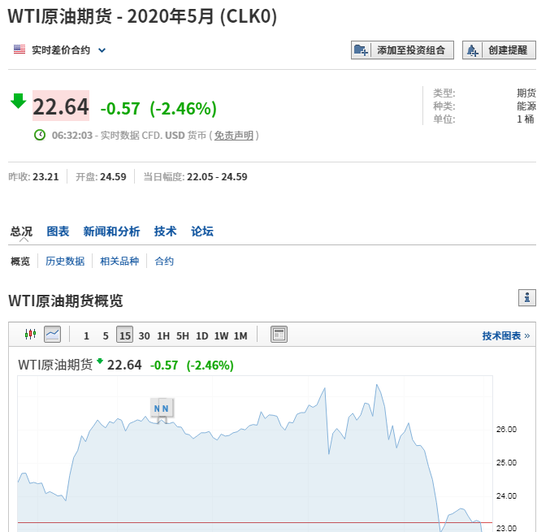 截至新加坡时间上午6:15,纽约商业交易所WTI跌1.4%至每桶22.44美元 。该合约上周下跌了近20%,而去年底在每桶61美元左右。