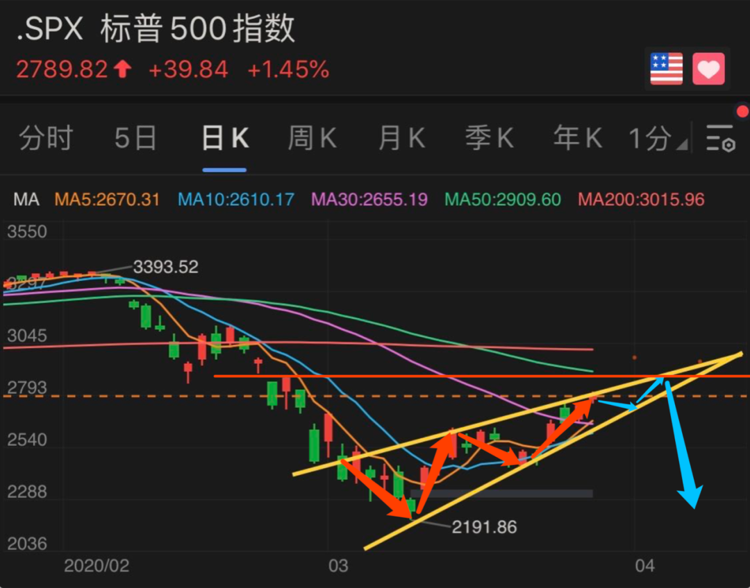 现在的技术形态是一个明显的上升楔形,但目前距离2883的压力位还有几个点的上涨空间,2900左右也有一个缺口,按照美股有缺口必补的习惯,很有可能大盘继续上涨。在没有反弹至压力位之前,千万不要做空,而大盘最有可能的走势,正如图所示。