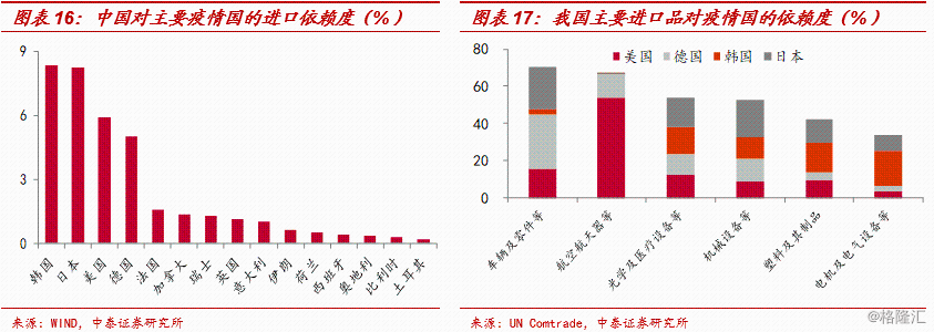 3、我国进口产业链:关注科技领域的冲击。虽然我国多数行业国际分工参与度有明显提升,尤其是科技类行业,但多数科技类行业仍然处于产业链中下游,对上游依赖度较高。我国对海外疫情严重国的进口依赖度将近40%,尤其是高新技术类产品依赖度更高,一旦产业链上游停摆,我国进口也会受到影响。