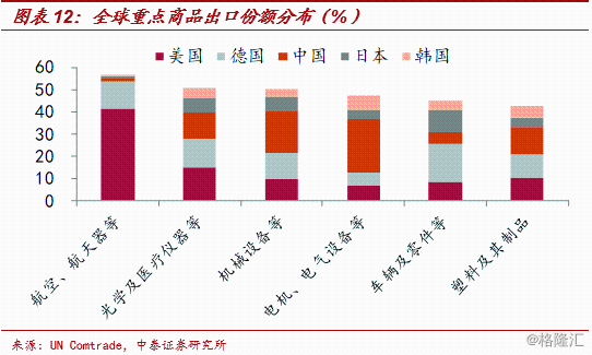 再细分一下,全球40%以上的航空航天设备出口由美国贡献,为全球最高;光学医疗设备、塑料制品出口主要由美、德、中三国贡献,均在10%以上;机械设备出口主要由中、德贡献,中国贡献接近20%;电气设备出口也主要由中国贡献,接近25%;车辆及零件出口主要由德、日贡献,分别为17%和10%。