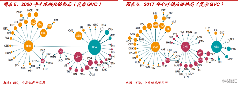 1、全球供需价值链:中、美、德三大中心。当前全球化程度较早期已有大幅提升,而全球供需产业链格局也所有变化,中国取代日本成为亚洲区域中心,形成以中、美、德为中心的新格局。不过,中国相比之前的日本,对美国的依赖度相对更低,且与更多的国家建立了密切的联系,区域内联系更加频繁。