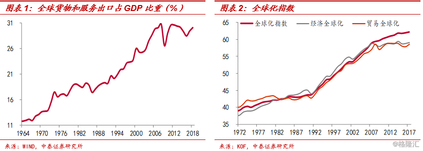 全球化程度已大幅加深。全球货物和服务出口占经济总量的比重,从1960年的11.8%大幅提升至2018年的30.1%,KOF编制的经济和贸易全球化指数也明显提高。