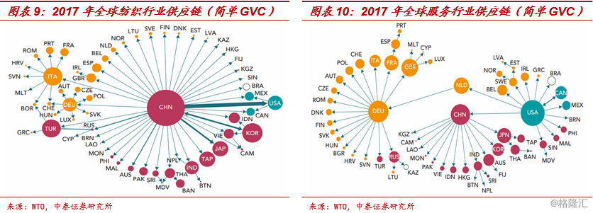 从具体行业来看,产业链格局的演变与总体趋势是一致的,但不同国家之间存在一定差异。比如,中国是全球最大的纺织业供应链中心;而美国是全球最大的服务业供应链中心。不过需要提醒的是,虽然中国也向多数亚洲国家供应服务业产品,但很多服务业最终产品的生产非常依赖于来自美国的中间品。