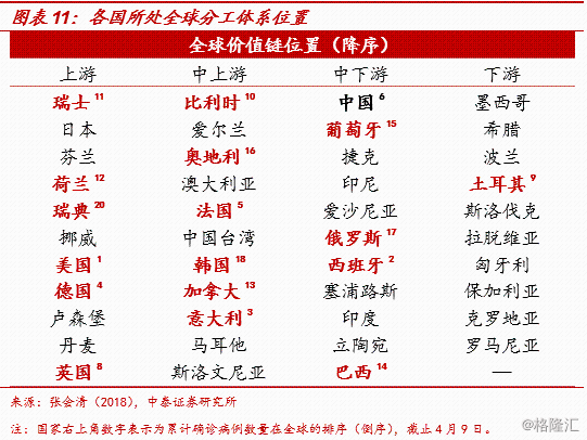从供应链角度来看,当前多数疫情严重国处于产业链上游或中上游位置。张会清等(2018)考虑到产品的技术属性后,对全球产业链上中下游进行了划分,当前疫情比较严重的欧美经济体,主要都属于全球供应链的上中游,尤其是美国、德国、日本等均处于全球价值链上游,主导着全球价值链,中国则处于中下游或者接近中上游的位置。所以疫情导致全球产业链上游受到巨大冲击,产业链中游和下游恐怕也难以独善其身。