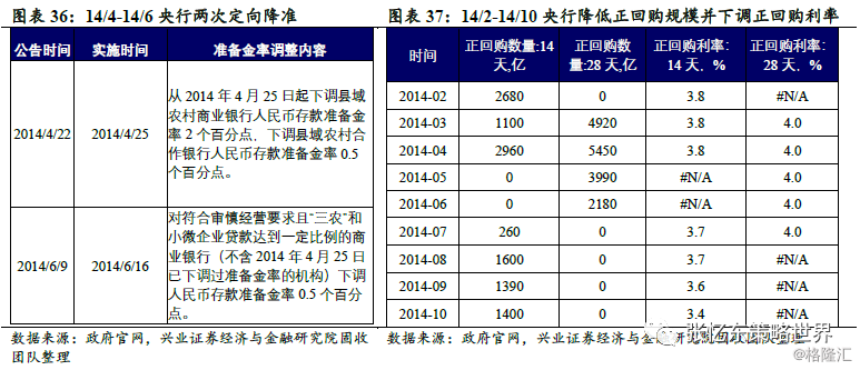 央行于2014年4月和6月分别进行了两次降准:1)从2014年4月25日起下调县域农村商业银行人民币存款准备金率2个百分点,下调县域农村合作银行人民币存款准备金率0.5个百分点。2)6月9日对符合审慎经营要求且“三农”和小微企业贷款达到一定比例的商业银行(不含2014年4月25日已下调过准备金率的机构)下调人民币存款准备金率0.5个百分点。