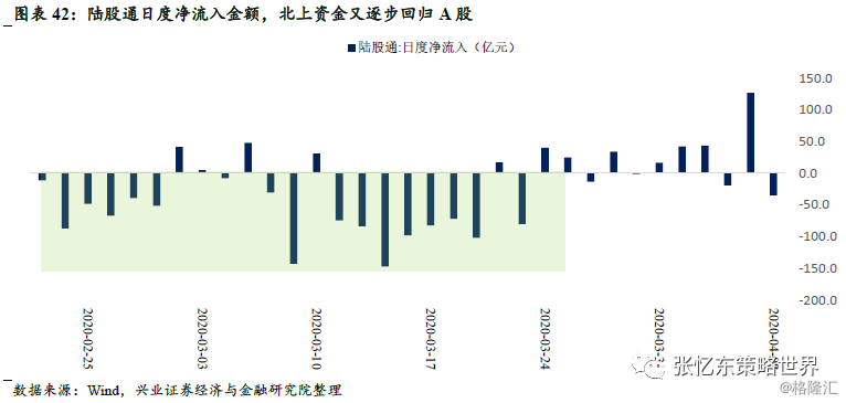 其次,海外流动性改善、4月欧美疫情有望逐步到达峰值而缓解,有助于维持海外风险偏好,有助于资金回流新兴市场。A股2月21日至3月23日,北上资金大幅流出1080亿元,但3月底至今,外资积极回流有助于延续A股短期反弹。
