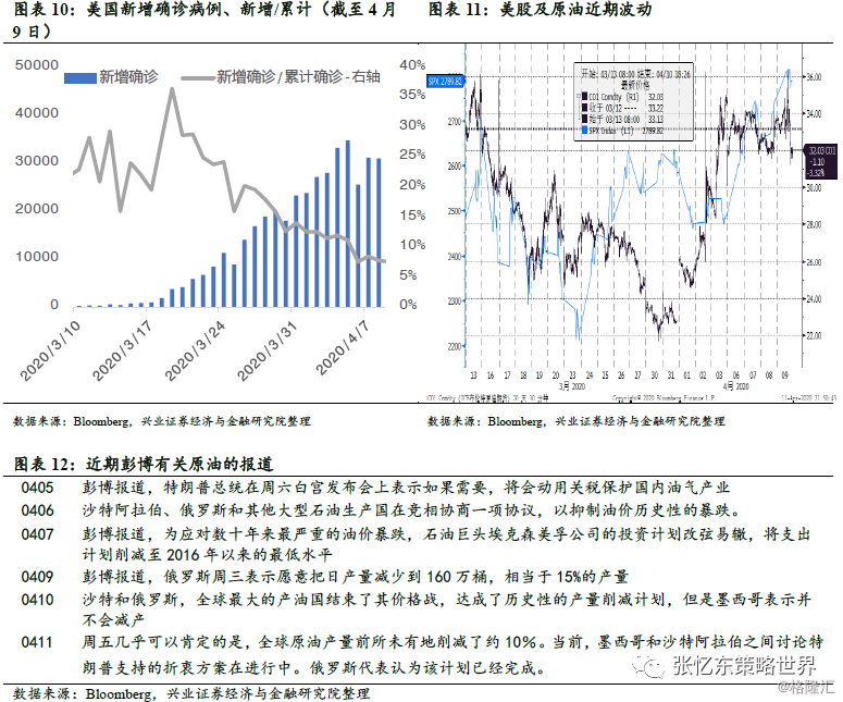 其次,“OPEC+”减产谈判。过去一周,减产谈判逐步明朗化,OPEC官方声明发布,减产协议以2018年10月产量为基准(沙特、俄罗斯以1100万桶/天为基准),减产分三阶段:(1)2020年5-6月减产1000万桶/天;(2)2020年7月-2020年12月,减产800万桶/天;(3)2021年1月-2022年4月,减产600万桶/天。引用4月11日彭博报道:“全球原油产量前所未有地削减了约10%……”。但后续,减产的效果受疫情及经济衰退的制约,对油价反弹及美股的带动作用将趋弱。