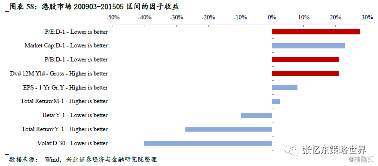首先,借鉴历史的规律,2008年金融危机之后驱动港股走强的最大贡献——估值因子大幅走强,即价值股走牛。从200903-201505区间因子收益来看,港股股价推动源于估值修复,PE和PB因子表现抢眼。此外,股息率因子表现同样抢眼。