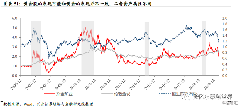 最后提醒的是,黄金股的表现可能和黄金的表现并不一致,二者资产属性不同。黄金股是风险资产;而黄金是避险资产。历史上看,当避险情绪主导时,黄金上涨而黄金股可能跟随股市下跌;在流动性危机阶段黄金下跌,而黄金股跌幅更大。当“资金充裕+风险偏好平稳+基本面避险”的阶段,黄金股往往大幅领先黄金。