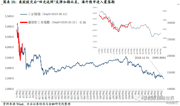 2)海外短期反弹阶段的政策刺激PK衰退预期,熊市新的跌途还需要等待“灰犀牛”的到来。美股短期情景预测是维持正负10%震荡,维持3月中旬我们提出的——美股可参考2015年A股“杠杆牛”后的股灾及7、8月的反弹。