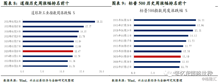 20200406-20200409道指(涨12.7%)、标普500指数涨12.1%、纳指涨10.6%,从3月23日美股盘中低点算起,此轮股灾后的反弹,三大指数最大涨幅都超过20%。