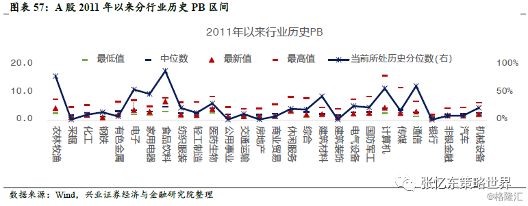 从市净率角度来寻找A股行业的估值洼地(以下括号内为其分位数数值,其历史区间为2011年第一个交易日至今)国防军工(22%)、机械设备(22%)、纺织服装(22%)、传媒(17%)、钢铁(14%)、轻工制造(13%)、交通运输(11%)、化工(9%)、汽车(8%)、非银金融(7%)、有色金属(6%)、商业贸易(6%)、房地产(1%)、建筑装饰(1%)、公用事业(1%)、采掘(1%)和银行(小于1%)。
