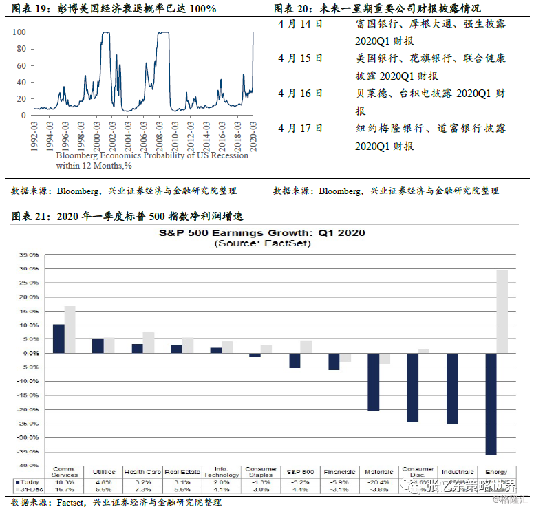 首先,美股盈利一致预期将持续下降。截至4月9日,Bloomberg标普500指数2020年一致预期EPS增速下降为—5.7%。