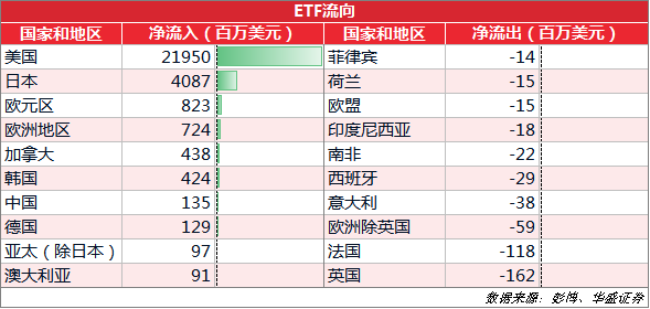美国和日本依然霸占资金流入榜前2位,其中美国吸金力惊人,净流入近220亿美元资金,是前一周的两倍多,而中国滑出了前三名,净流入1.35亿美元。