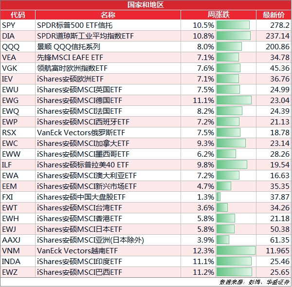 按照前5个交易日的累计涨跌幅来看(即上上周五到上周五),全球主要市场一片大好,全部上涨。
