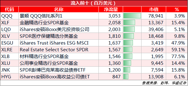 追踪纳斯达克100指数的QQQ成为上周最欢迎的ETF,美元投资级公司债基金LQD连续三周获得大量资金押注,上周再流入21亿美元,规模不断扩大,最火爆ETF之位当仁不让。