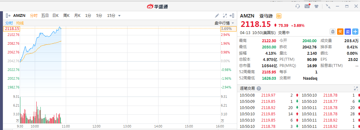 截至发稿,亚马逊股价涨3.69%,报2118美元。