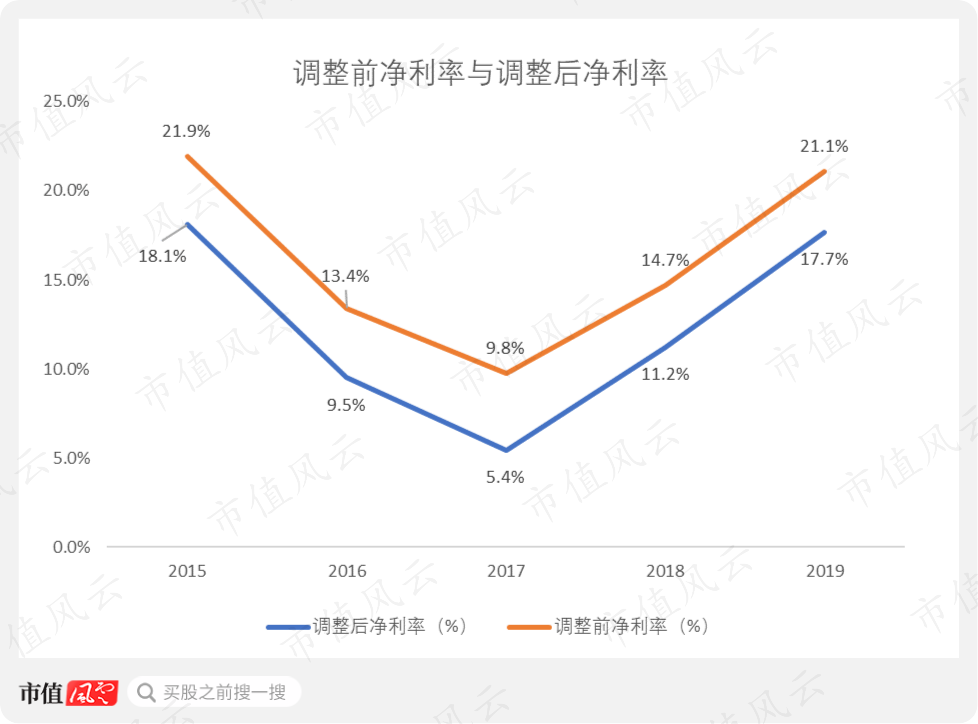 不过,不管是调整前的净利率,还是调整后的净利率,两者的走势是基本一致的,都在2015-2017年间,经历了下滑,后来又都经历了V型反弹。