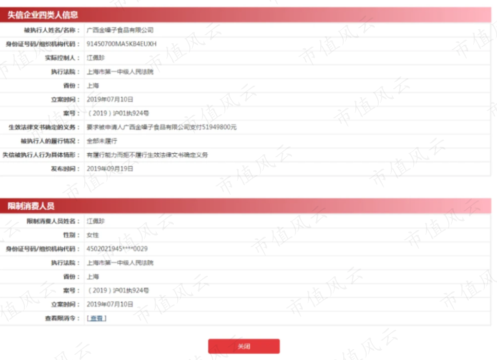 2019年9月,金嗓子食品被列入失信被执行人名单,实控人江佩珍被列为限制消费人员,也即老赖。
