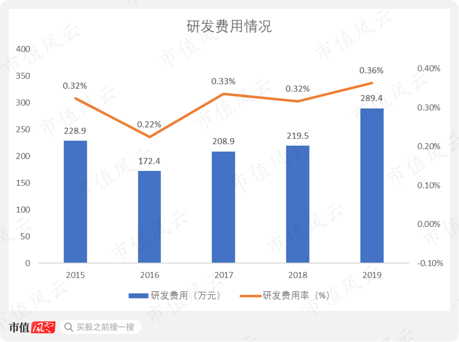金嗓子的研发支出没有资本化的部分,研发费用先从2015年的229万元下降至172万元,后又逐渐回升至2019年的289万元。