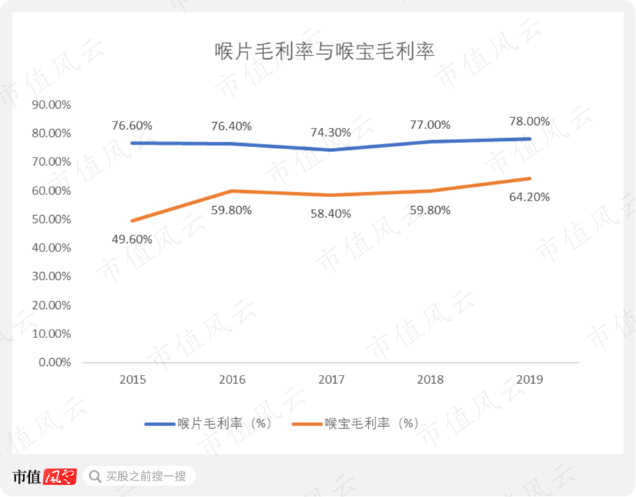 也就是说,喉片的毛利率要比喉宝的毛利率高出近15个百分点。